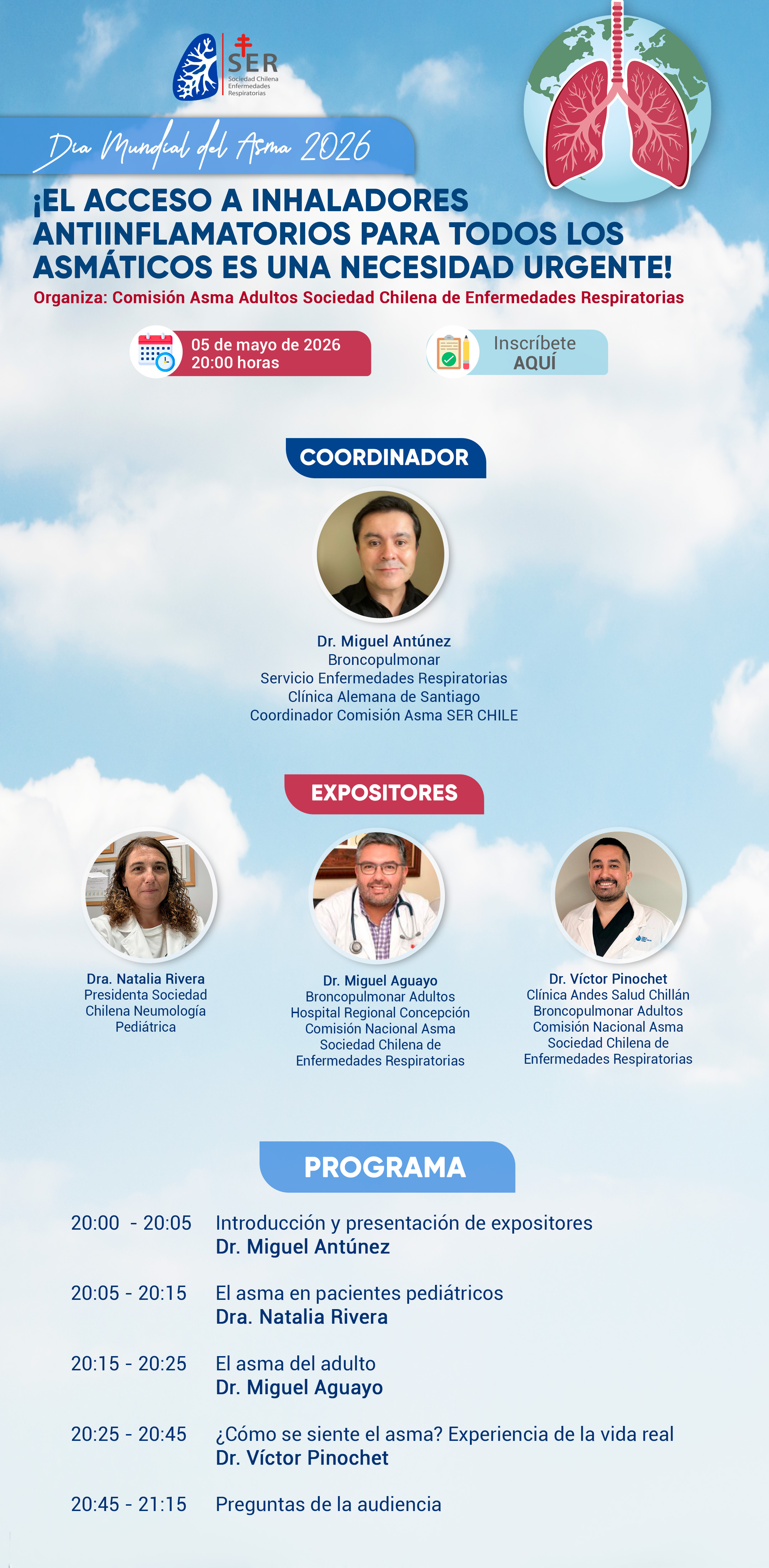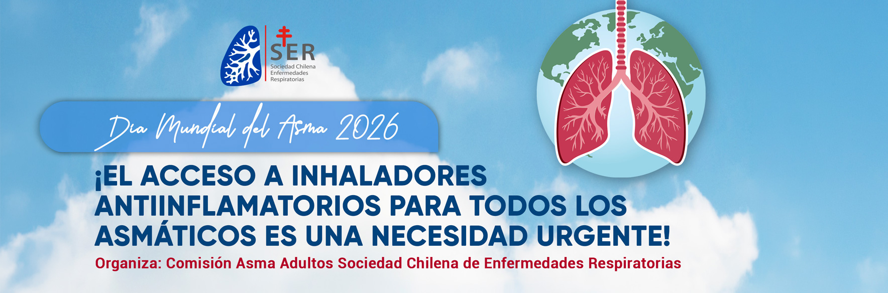 En el marco del Día Mundial del Asma, la Sociedad Chilena de Enfermedades Respiratorias (SER Chile), con la participación de la Sociedad Chilena de Neumología Pediátrica (SOCHINEP), invita a participar en el webinar “Día Mundial del Asma 2026”.